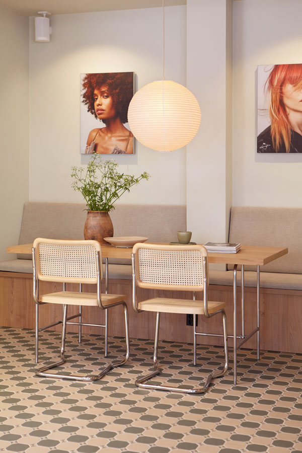 Gulvet er lagt med Venezia-fliser fra TopCer, inspirert av viktorianske mønstre. Det grafiske uttrykket tilfører rommet tydelig karakter, samtidig som overflaten er robust og enkel å vedlikeholde i en travel salonghverdag. Venezia-mønsteret løfter helheten og binder sammen de organiske formene og varme materialene i interiøret – med et tidløst og varig uttrykk.