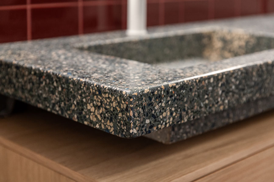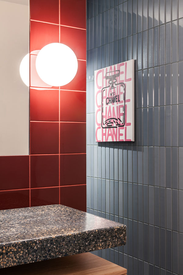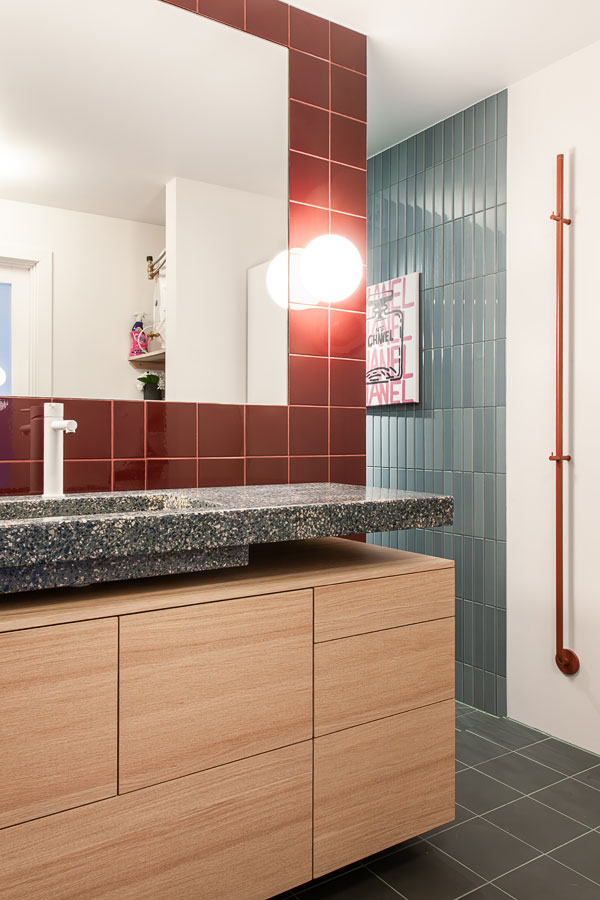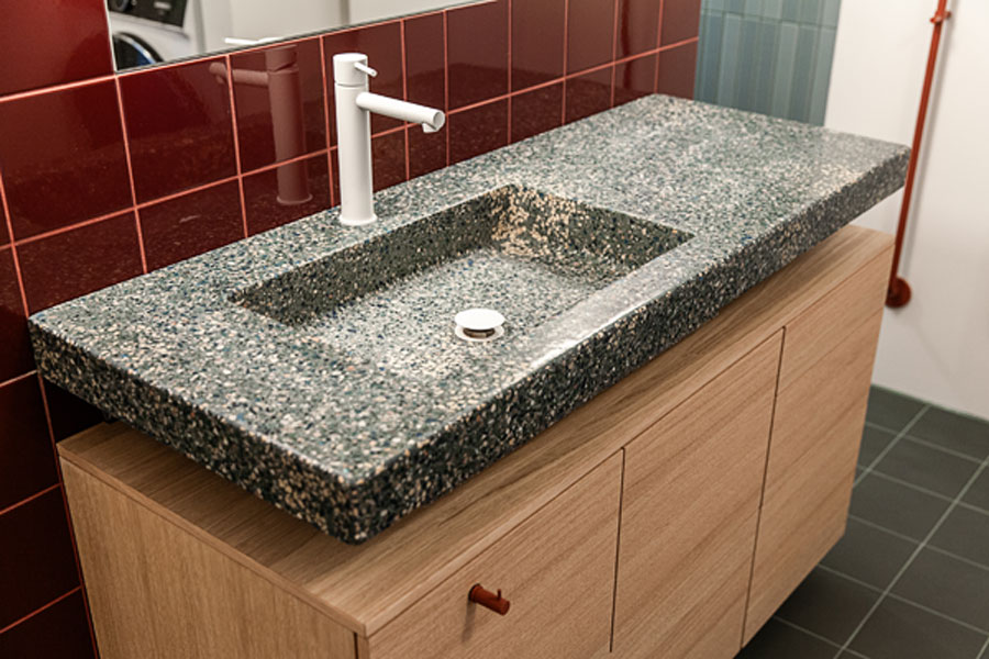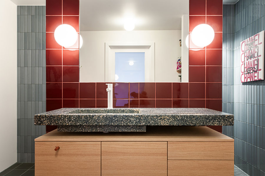 Mot denne veggen er en spesialdesignet, håndlaget servant fra Huguet plassert. Den massive terrazzovasken er støpt i en mørk base med tilslag i glassblå- og terracottafarger, og tilfører både tyngde og detaljrikdom. Materialets sammensetning forsterker servantens skulpturelle form, og innredningen, utført av Drøbak Micro-snekkeri, er tilpasset vaskens volum og uttrykk.
