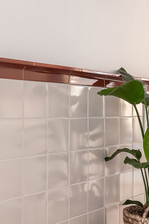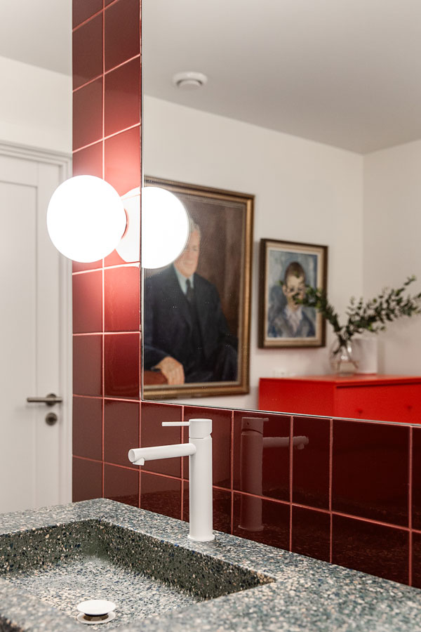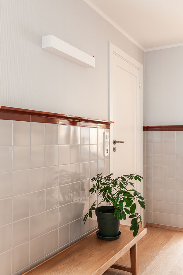 I gangen er flis brukt på en måte som sjeldnere sees i norske boliger, men som har en tydelig forankring i europeisk boligarkitektur. Veggene er kledd med Victoria Piano fra Etruria opp til brystningshøyde, og avsluttes med en markert dekorflis i en dyp rød tone. Listen danner en presis overgang mellom flis og tapet. Over flisene fortsetter veggen med en nålestripet tapet som henter opp fargene fra veggflisen og skaper en helhetlig sammenheng.