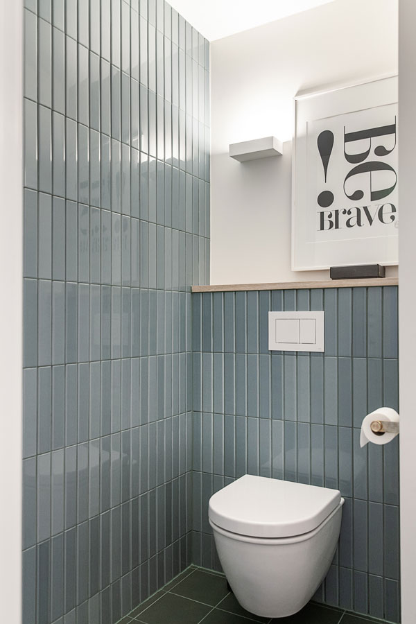 Badet er resultatet av en sammenslåing av et tidligere bad og en innvendig bod. Det nye rommet oppleves romslig og tydelig organisert. Veggen midt i rommet, kledd i Victoria Piano 15×15 fra Etruria, etablerer et sentralt tyngdepunkt. Veggen fungerer både som romdeler og som bakteppe for baderomsinnredningen, og deler badet i definerte soner med dusj på den ene siden og toalett på den andre.