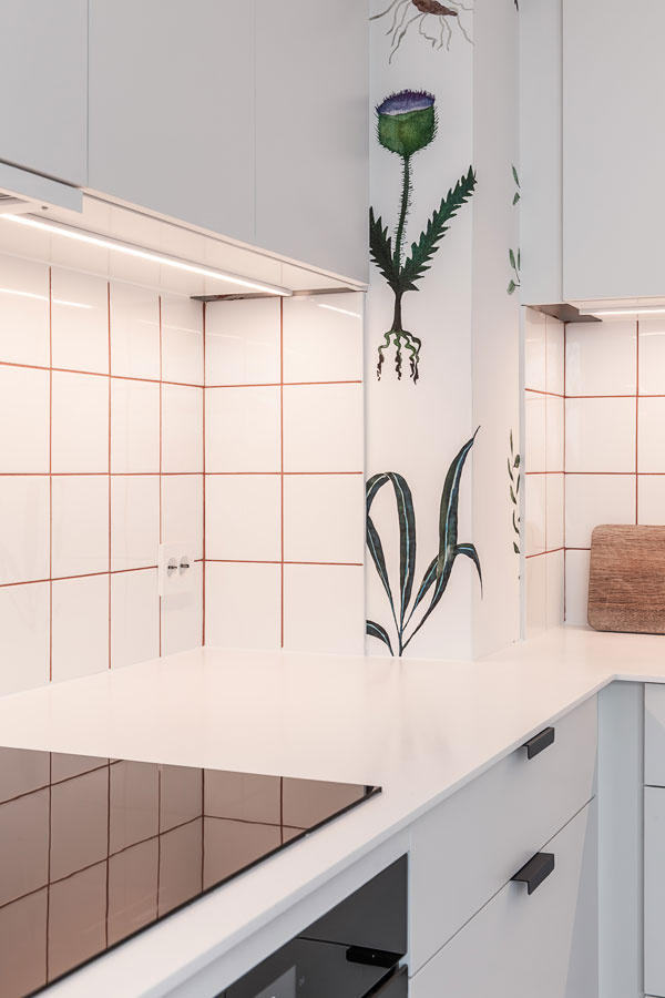 Kjøkkenet er lyst og minimalistisk, med flislagt vegg som et grafisk element. Veggflisen er en klassisk, hvit 15×15-flis lagt i et stramt rutenett, som står i kontrast til den organiske, florale tapeten. Fugefargen fra Fugabella Color aktiverer veggflaten, med en varm, dyp rød tone som tegner opp mønsteret og gir en tydelig kontrast til den hvite innredningen.